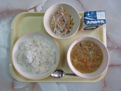 〇かまだきごはん きのこカレー だおこんサラダ 牛乳