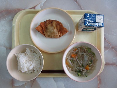 〇むぎごはん つギョウザ はるさめスープ 牛乳