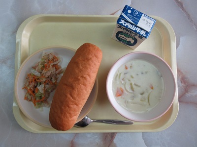 〇こめこいりパン あきのにぎわいシチュー ツナサラダ 牛乳