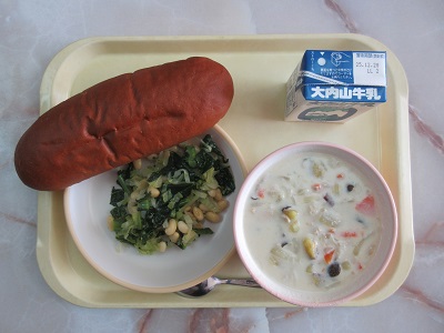 〇こくとうパン サーモンチャウダー アレッタとだいずのサラダ 牛乳