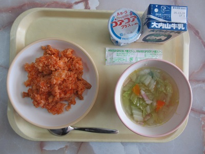 〇チキンライス(むぎごはん) はくさいスープ ヨーグルト 牛乳