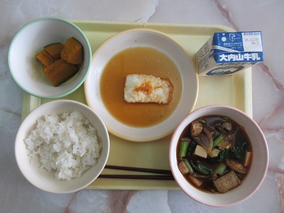 〇むぎごはん とりのからあげ のっぺいじる はくさいづけ 牛乳