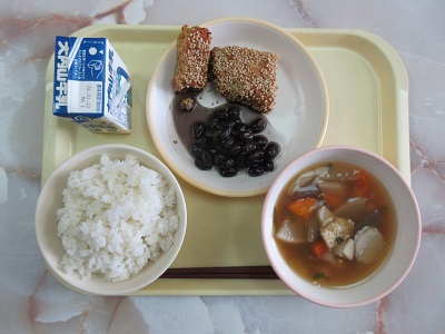 〇むぎごはん 松風焼 のっぺいじる くろまめ 牛乳