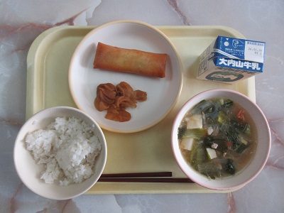 〇むぎごはん チーズはるまき ちゅうかやさいスープ つぼづけ 牛乳