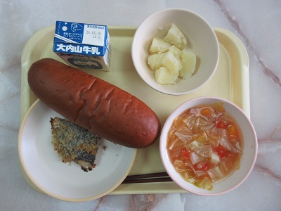 〇こくとうパン サワラのパンこやき ミネストローネ こふきいも 牛乳