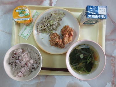 〇せきはん とりのからあげ キャベツともやしのしそあえ ほうれんそうのすましじる みかんゼリー 牛乳