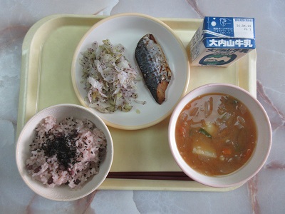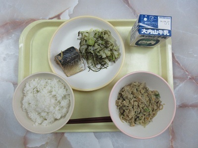 〇むぎめし サバのしょうがに おからのいりに キャベツのこんぶあえ 牛乳