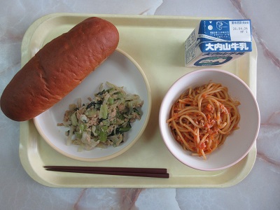 〇こくとうパン スパゲッティミートソース きりぼしだいこんのサラダ 牛乳