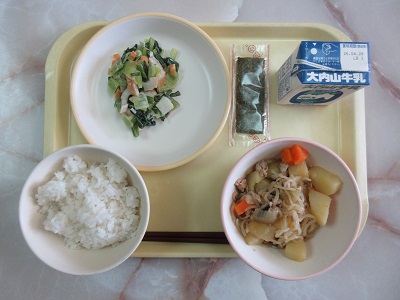 〇むぎめし にくじゃがのうまに わけぎとちくわのマヨネーズふうあえ やきのり 牛乳