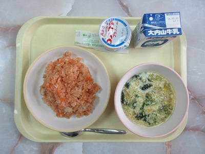 〇チキンライス(むぎめし) たまごスープ ヨーグルト 牛乳