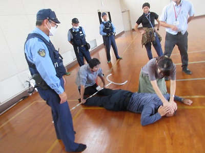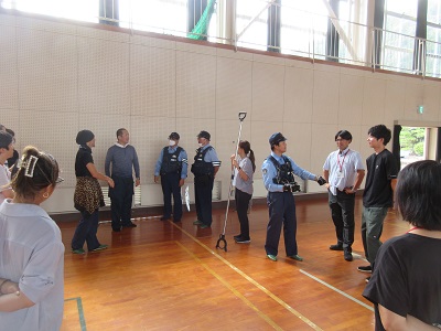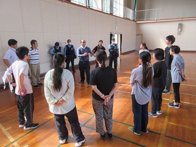 〇【0910】避難訓練(不審者対応)に向けて、川口・八ツ山駐在所の野村さんと榊原駐在所の小古さんに不審者確保に対する講習会を行っていただきました。児童の安全確保はもとより、いろいろな対応の仕方を教えていただきました。また、100当番通報の仕方やマニュアルも説明していただきました。