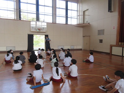 〇【0530】1年生誘拐防止教室を行いました。2名のおまわりさん(河合係長さん・駐在署野村さん)が来てくれました。