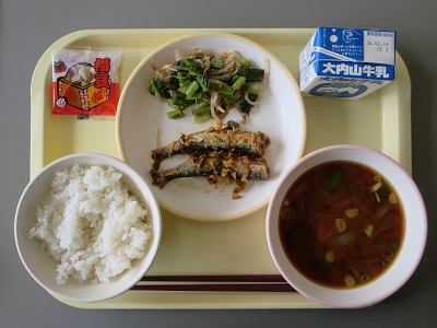 〇むぎごはん いわしのなんばんづけ えのきじる こまつなのおかかあえ せつぶんまめ