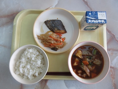 〇むぎごはん さわらのてりやき すいとん あいまぜ 牛乳