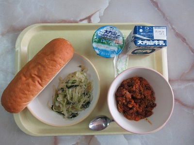 〇こめこいりパン チリコンカーン こまつなのサラダ ヨーグルト 牛乳