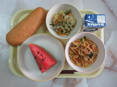 〇ロールパン ツナとトマトのスパゲッティ くさわかめのサラダ すいか 牛乳
