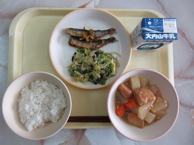 〇むぎごはん いわしのなんばんづけ だいこんのそぼろに キャベツとこまつなのごまあえ 牛乳