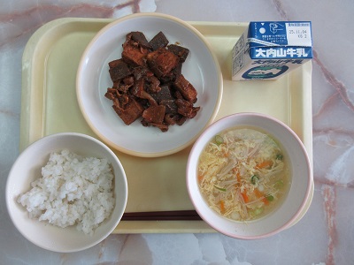 〇むぎごはん あつあげのみそいため たまごスープ 牛乳