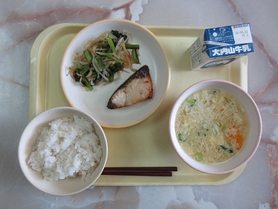 〇むぎごはん ぶりのてりやき こまつなともやしのおかかあえ かきたまじる 牛乳