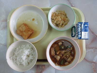 〇むぎめし いかのあげに ぼんじる しょうがじょうゆあえ 牛乳
