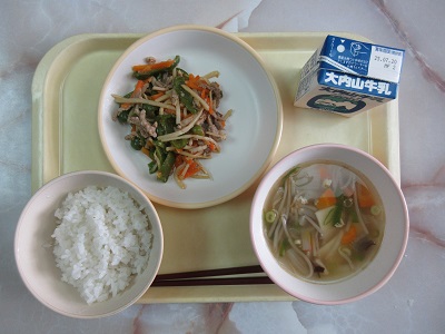 〇かまだきごはん チンジャオロースー ワンタンスープ 牛乳