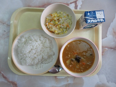〇かまだきごはん なつやさいのカレー コーンサラダ 牛乳