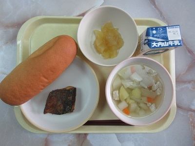 〇ロールパン サバのカレームニエル かぶのポトフ てづくりりんごジャム 牛乳