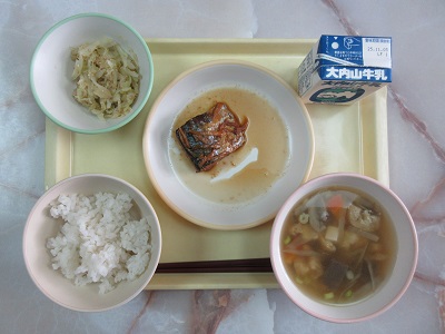 〇むぎごはん さばのしょうがに けんちんじる キャベツのあさづけ 牛乳