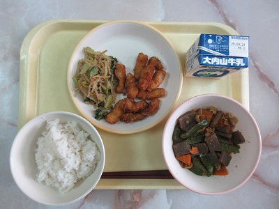 〇むぎごはん いかのかりんあげ こんにゃくとピーマンのいためもの チンゲンサイともやしのごまあえ 牛乳