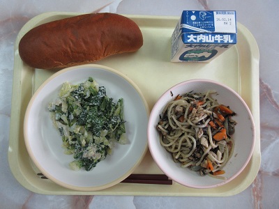 〇こくとうパン ひじきとツナのわふうスパゲッティ アレッタのごまドレシングあえ 牛乳