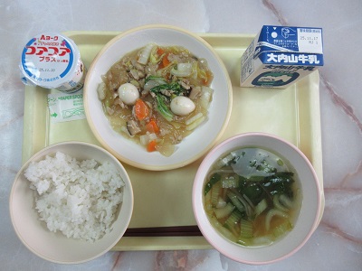 〇むぎごはん はっぽうさい ワンタンスープ ヨーグルト 牛乳