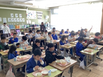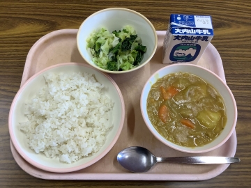 今日で二学期最後の給食となりました。今日の給食メニューは子どもたちの大好きなカレーです。調理員さんからも「二学期もたくさん食べてくれてありがとう!」のメッセージカードを各クラスにいただきました。二学期は一学期と比べて残飯も減りました。来年も好き嫌いなくモリモリと給食を食べて、みんな大きく成長してほしいと思います。