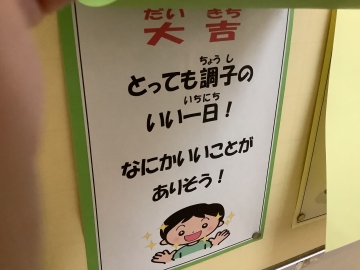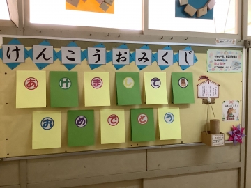 新年を迎えたこの時期、保健室の前には「けんこうおみくじ」が掲示されています。おみくじを引くと、出た文字に応じて大吉、小吉などが書かれていて、その日の健康を占ってくれます。みんなが健康で毎日を楽しく過ごせるようにと保健の先生が作成してくれました。寒さに負けず、三学期も全校のみんなが元気に過ごせることを心から願っています。