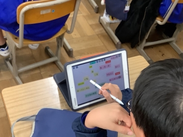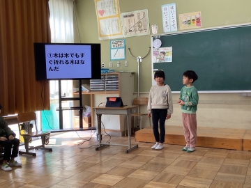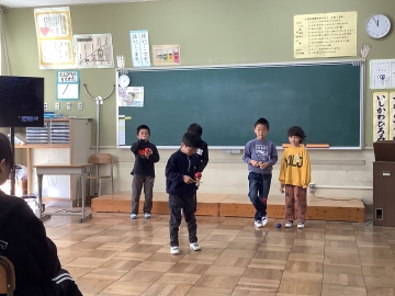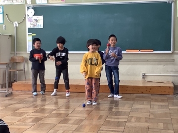 1年生の教室をのぞくと、各グループに分かれて発表会が行われていました。あるグループではケン玉を披露したり、他のグループはなぞなぞクイズを出題したり、独楽を回したり、ピアノを弾いたりと、自分たちのしたいことを披露し合っていました。見ている友だちも「がんばれー」「あーおしい!」「あっ分かった!」と応援したり盛り上げたりして、発表会を全員で楽しんでいました。見ていてとても微笑ましい光景でした。