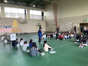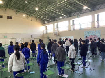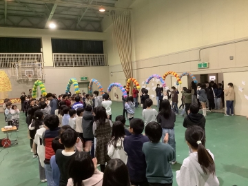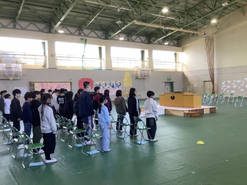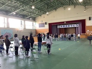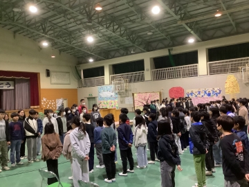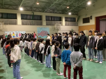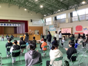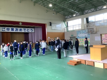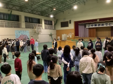 今日の4限目、体育館にて1年生から4年生までの在校生と6年生とで「お別れ式」を行いました。明後日の卒業式には5年生しか参加できないため、1~4年生にとって6年生とお別れを言える日は今日となります。「世界がひとつになるまで」の歌をみんなで歌った後、在校生から「縦割り班がとても楽しかったです」「学校のために動ける上級生になります!」「中学校へ行っても頑張ってください」と呼びかけの言葉がありました。6年生が学校に来る日も残すところ2日だけとなりました。淋しくなります。