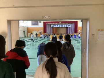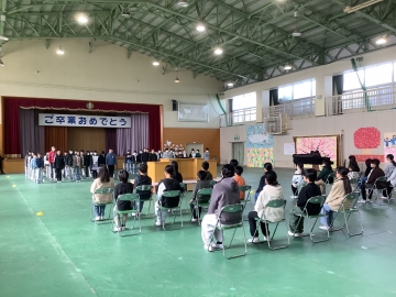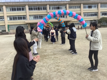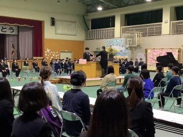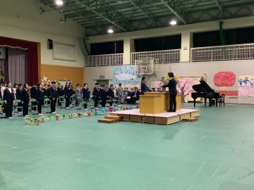 本日、令和7年度の卒業証書授与式を体育館で行いました。式が始まる前は雨が降っていましたが、途中から晴れ始め、多くの保護者、学校運営協議会の皆様に見守られながら、子どもたちにとっては素晴らしい旅立ちの日となりました。本日、無事に卒業式を迎えられたのは、保護者の皆様、地域の方々のご協力とご理解、ご支援をいただいたことに尽きると心より感謝致します。卒業生40名の健やかな成長を職員一同心よりお祈りしております。