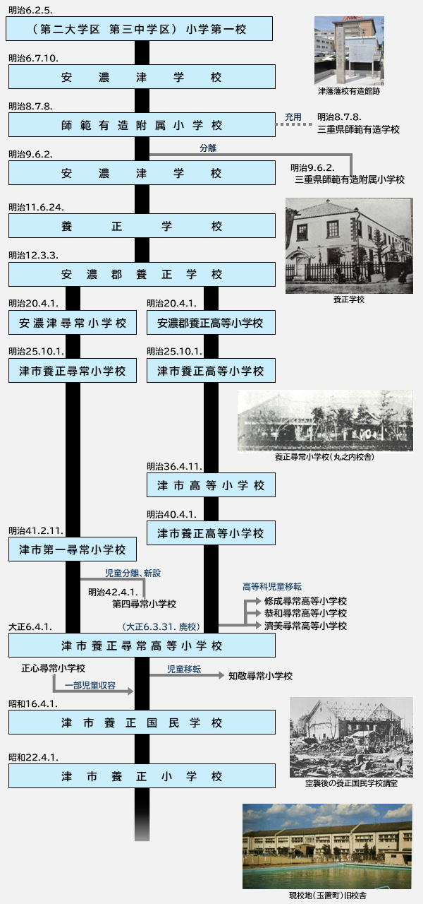 この規則に従って、明治6年(1873年)2月5日に「第三中学区小学第一校」が開かれました。これが養正小学校の始まりで、創立記念日はこの日を記念したものです。津市では、同年5月に、今の修成・南立誠・新町小学校にあたる学校も開かれています。
