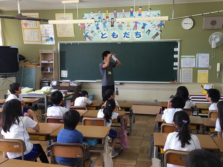 英語活動です。ALTのブランドン先生がトイレットペーパーを使って、発音の仕方の見本を見せています。(2年)