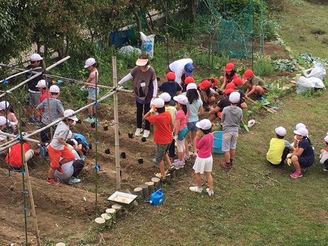 理科で、学級園にほうせんかの苗を植えています。(3年)