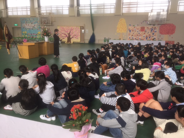今日は、1年生から4年生までの子どもたちが6年生とお別れ式を行いました。