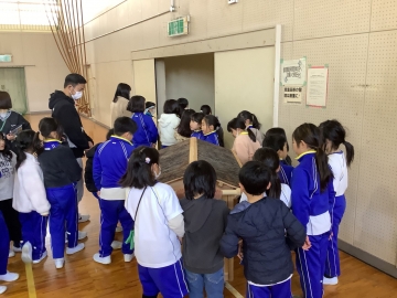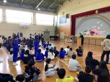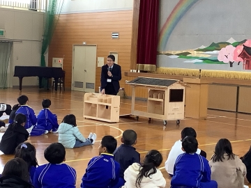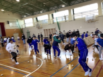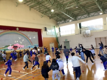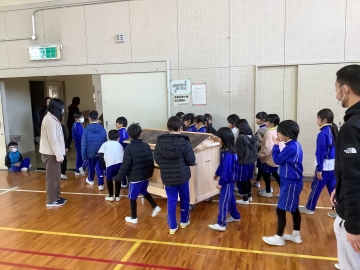 2月2日(月)の全校集会では任命式と表彰式の他に、児童会が考えた「動く玉入れ」で全校みんなが遊びました。この日は久居農林高校の生徒さんが製作してくれた「旅する本棚」(移動本棚)のお披露目も行い、子どもたちからも「すごーい!」「本のお家みたい!」と興味津々でした。久居農林高校の皆さん、ステキな本棚をありがとうございました。大切に使います。