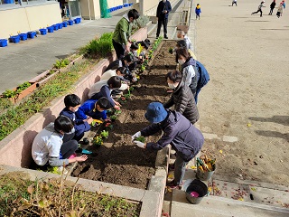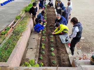 園芸委員会の子どもたちが、地域の人たちと一緒に花の苗を植えました。