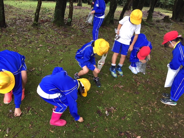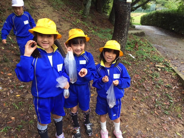 先生の話を聞いた後は、早速、ドングリを拾っています。たくさん落ちていますね。