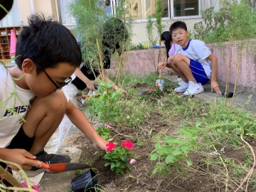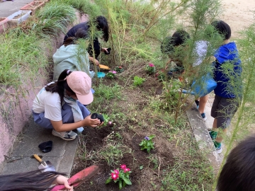 高学年が中心に活動している各委員会では、放送委員や体育委員など活動している様子が分かりやすい委員会もありますが、縁の下の力持ちのような委員会もあります。そのうちの一つが園芸委員会で、学校園の雑草を丁寧に抜いてくれたり、新しい花々を植えてくれたりしてくれています。いつもキレイな学校園にしてくれてありがとう。