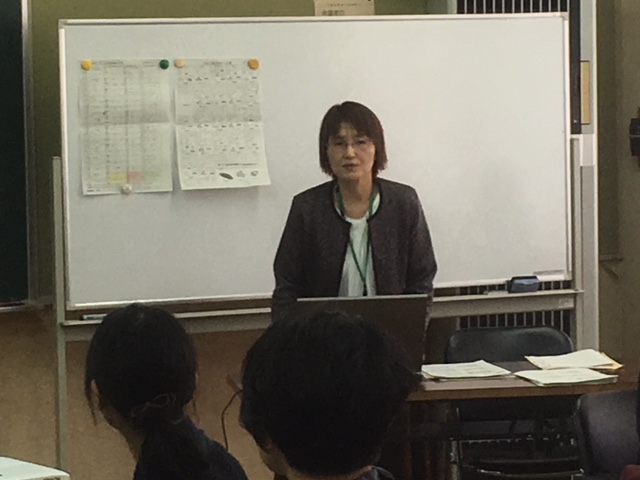給食を食べた後は、新町小の中野先生に給食や栄養についてのお話を聞きました。