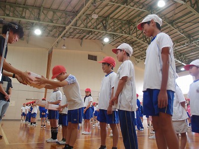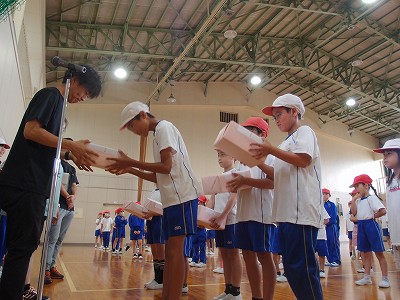 参加賞を受け取る場面ですが、子どもたちは、誰から教えて
