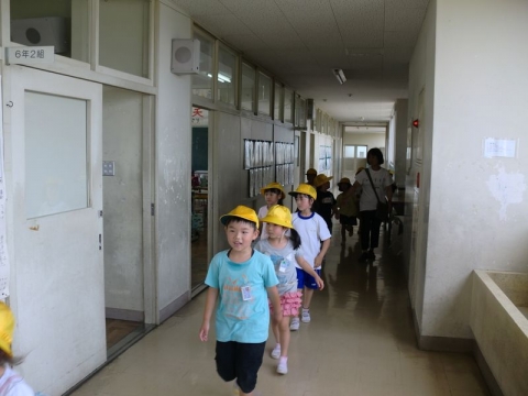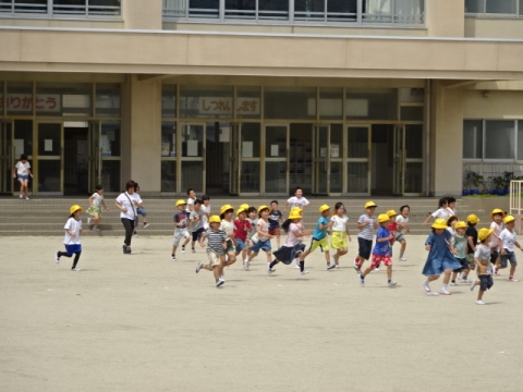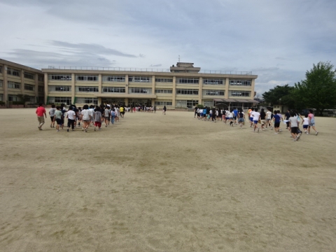 大地震が起こり、運動場に避難したが、津波の危険性があるので、校舎内の安全を確認したうえで、3階に全員が再避難するという設定で避難訓練をしました。
