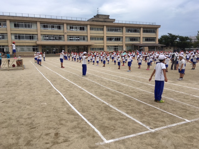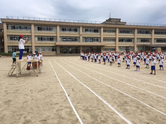 9/15(木)、てるてる坊主の効果はすばらしいです。うす曇りの天気の中、全校練習をしました。