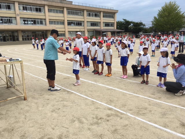 閉会式で参加賞を受け取る練習もしました。PTAから素敵なノートがいただける予定です!