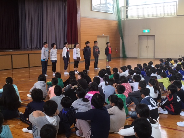 今日は、1年生から4年生までの子どもたちが6年生とお別れ式を行いました。